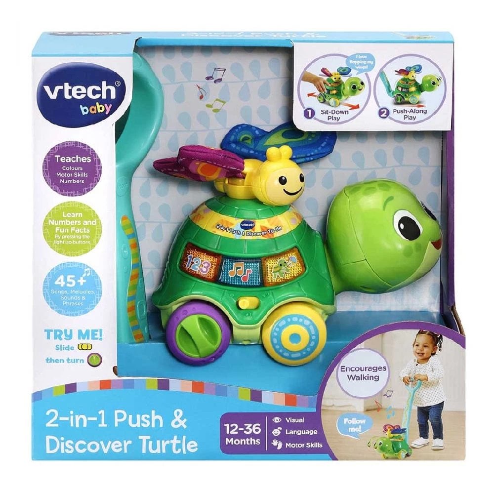 Meet the 2-in-1 Push & Discover Turtle by VTech! This adorable little turtle and butterfly really are babys best friends! The easy-to-grab handle is perfect for little hands and easily detaches for two ways of play. The light up number button, music button and turtle & butterfly button introduce the turtle and butterfly, counting, sounds, melodies and phrases. Little explorers can push the turtle to activate the motion sensor and hear playful sounds and short phrases.