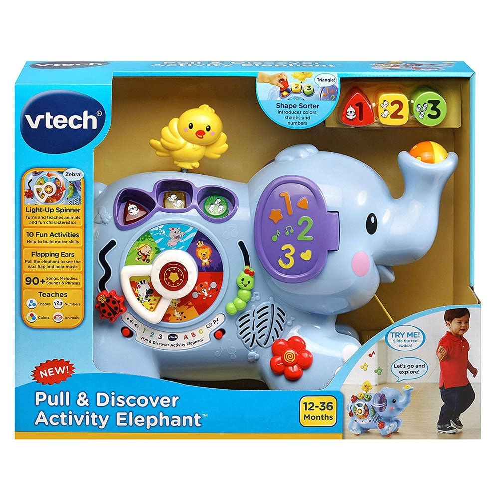 An Elephant never forgets and your little one won’t either when they go on new adventures with their Pull and Discover Activity Elephant(TM) by VTech®! Turn the spinner and your little jungle explorer will learn about the jungle friends, what sounds they make, fun phrases and music. They can also press light-up buttons that encourage motor skills or match the blocks with the shape sorter to discover colors, animals and shapes. When your little adventurer is feeling a bit wild, the elephant is great on the go with a pull string that plays music and fun sounds when the elephant is pulled along. Welcome to the jungle