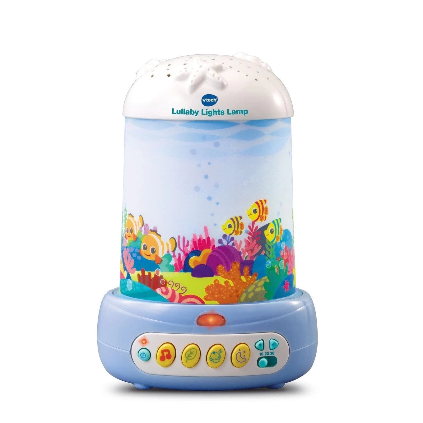 Soothe your baby to sleep with the Sea Soother by VTech! This magical rotating lamp and light projector is ocean themed for your little ones’ enjoyment. As your baby goes to sleep, they can watch their ocean friends swim around the lamp, or watch the soft light patterns glow onto the ceiling from the projector. Features soothing songs, peaceful lullabies, gentle ocean sounds, and white noise. Use the remote control to play or pause the music, sounds, or lights. The Lullaby Lights Lamp has a 10, 20, or 30-minute timer and a volume control button. Includes 3 sing-along songs and 40 melodies.
