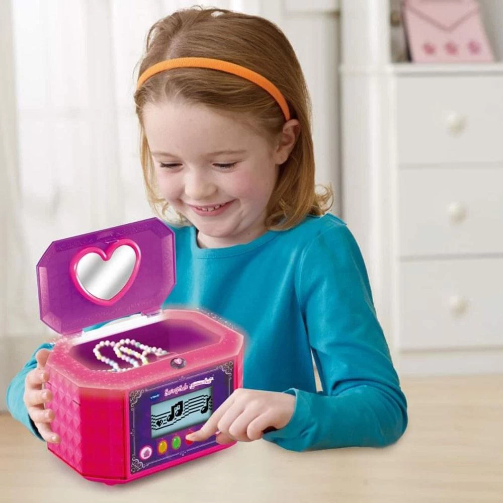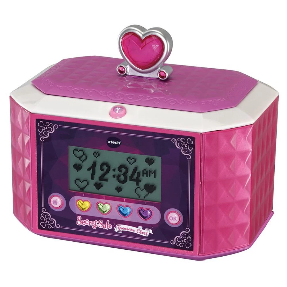 Keep your treasure safe with the Secret Safe Treasure Chest by VTech! This beautifully designed Treasure Chest is great for protecting your treasures. Unlock the Treasure Chest with your very own 4-digit password to keep your secrets safe inside. Use the built in alarm clock to help you wake up just in time to head off for the day. Play 9 great learning activities that cover spelling, maths, logic and more! The built in speaker allows you to play your favourite songs by connecting it to an external music player (not included).