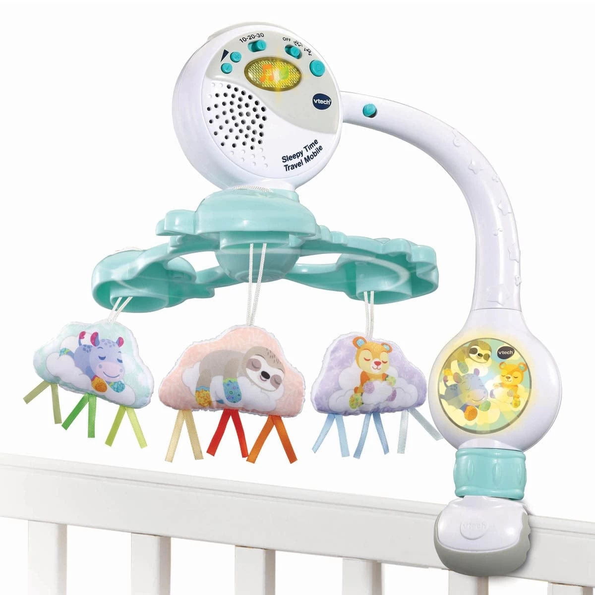 Lull baby into a peaceful slumber with the Sleepy Time Travel Mobile. 10/20/30-minute timer. Mesmerise baby with the soft, twirling animal clouds and soothe with the glowing light, 3 sing-along songs, 40 calming melodies, and nature sounds. There’s no need to disturb the baby once they’re asleep with the 10/20/30 minute timer, which automatically shuts the music off.