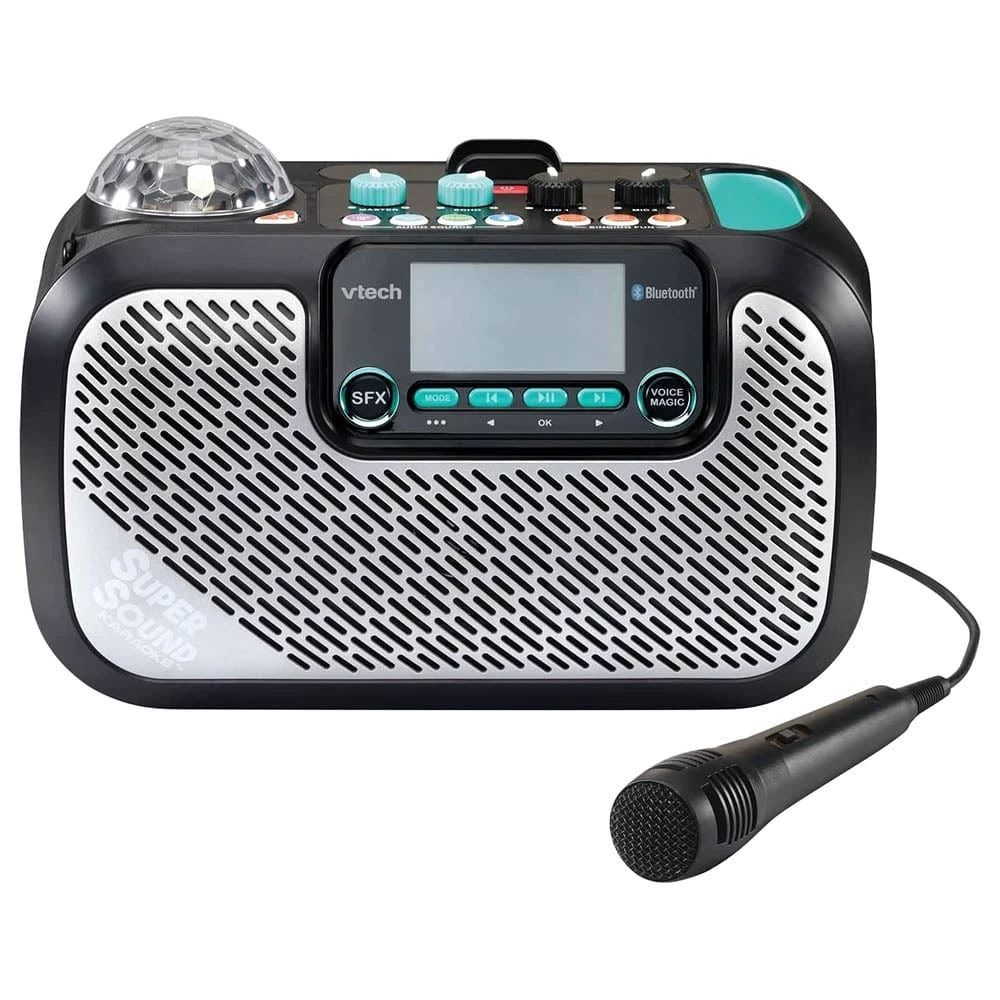 It’s a portable party with the Super Sound Karaoke machine! Stream your own music through Bluetooth wireless technology or tune into the FM radio. Sing along to your favourite songs!